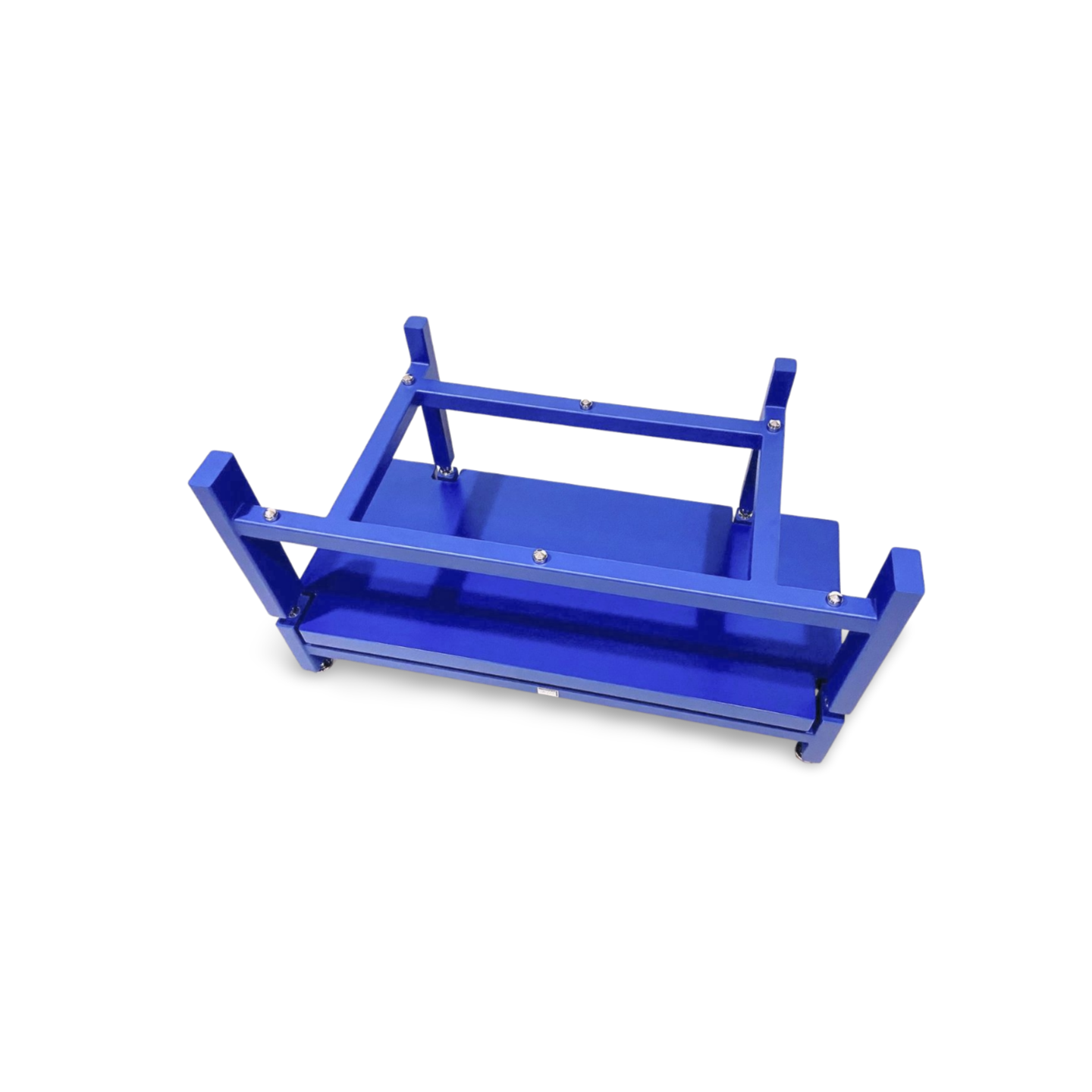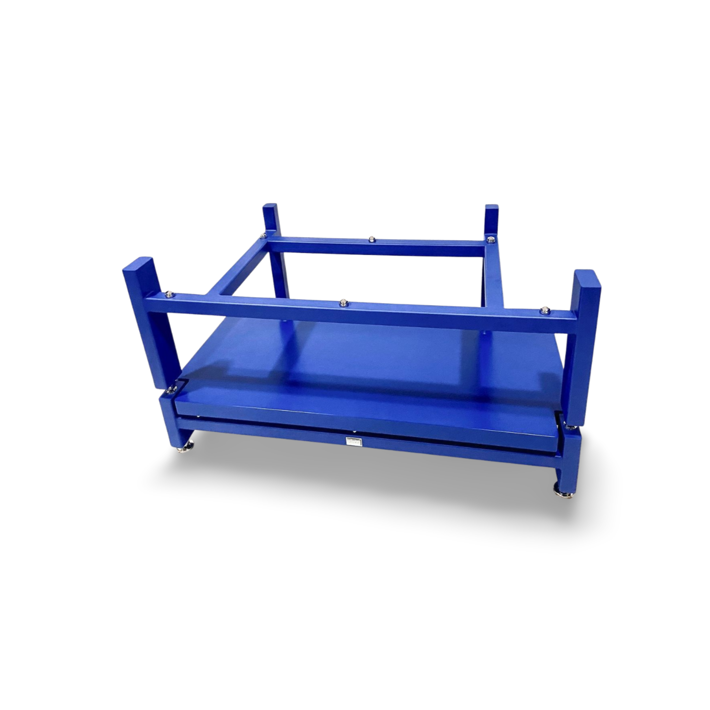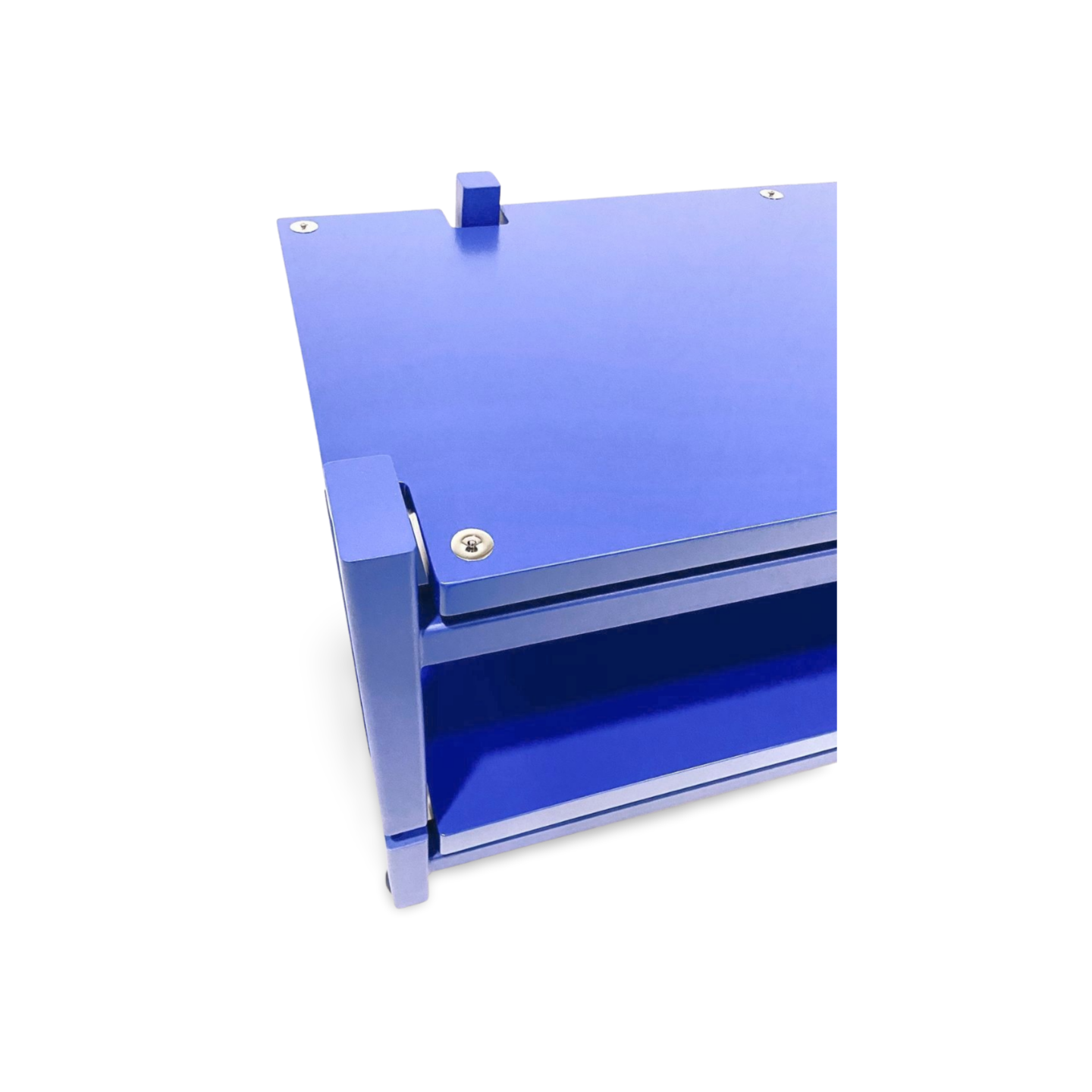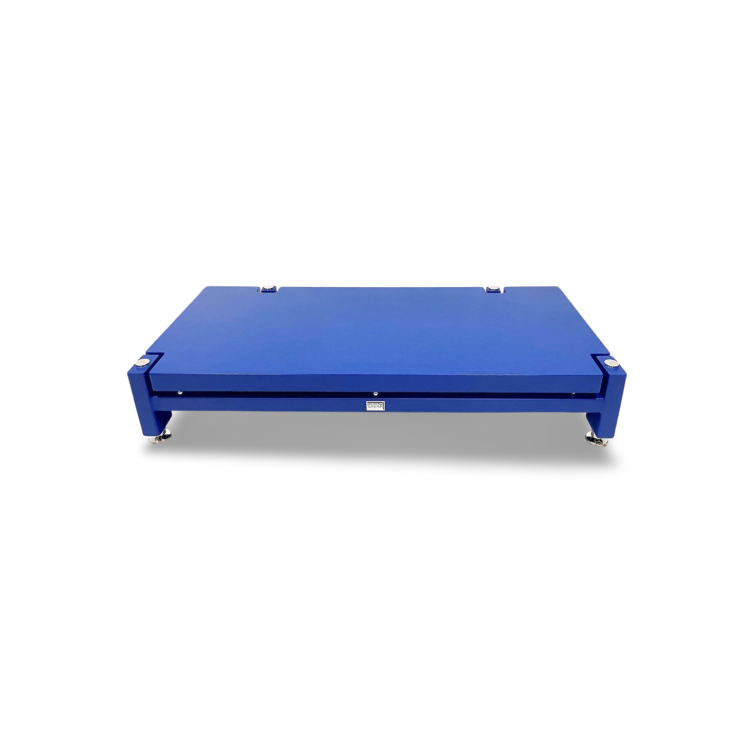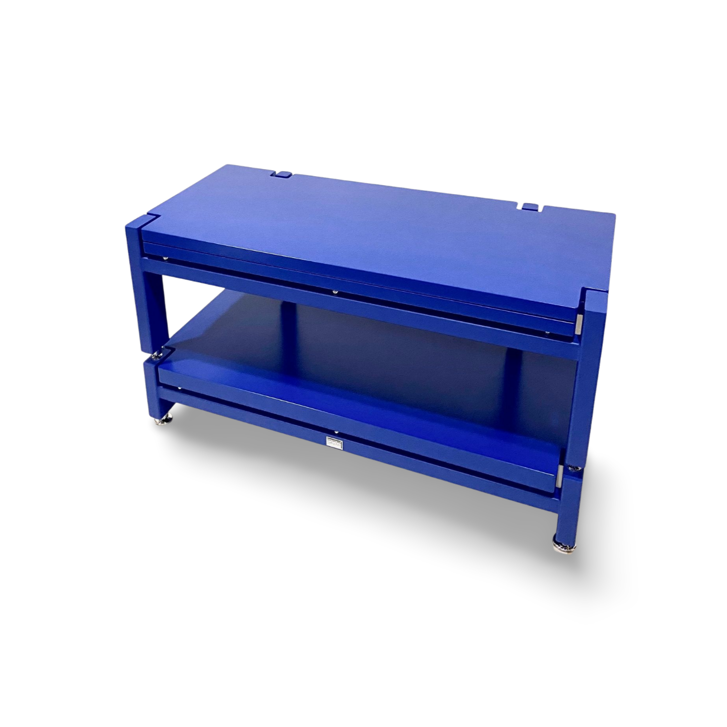 Stolik dwupoziomowy, czteronożny, podstawa w kształcie trapezu. Stelaż stolika wykonany ze stali konstrukcyjnej. Łączenie poszczególnych elementów stelaża wykonane poprzez spawanie zewnętrzne, na całym obwodzie łączonego elementu. Profil stelaża: nogi przednie: 80 x 40 x 3 mm, reszta: 40 x 40 x 3 mm. Malowanie stelaża: proszkowe, w kolorze RAL 5010, wykończenie matowe. Materiał blatu: MDF, malowanie w kolorze RAL 5010, wykończenie matowe. Grubość blatów: 2 x 30 mm – górny poziom, 1 x 46 mm – dolny poziom. Zawieszenie blatów: układ AHMS (Anti-vibration Horizontal Moving System) oraz stożki antywibracyjne pod dolny blat górnego poziomu. Waga kompletu: 70 kg. Obciążenie blatów: 100 kg każdy poziom.